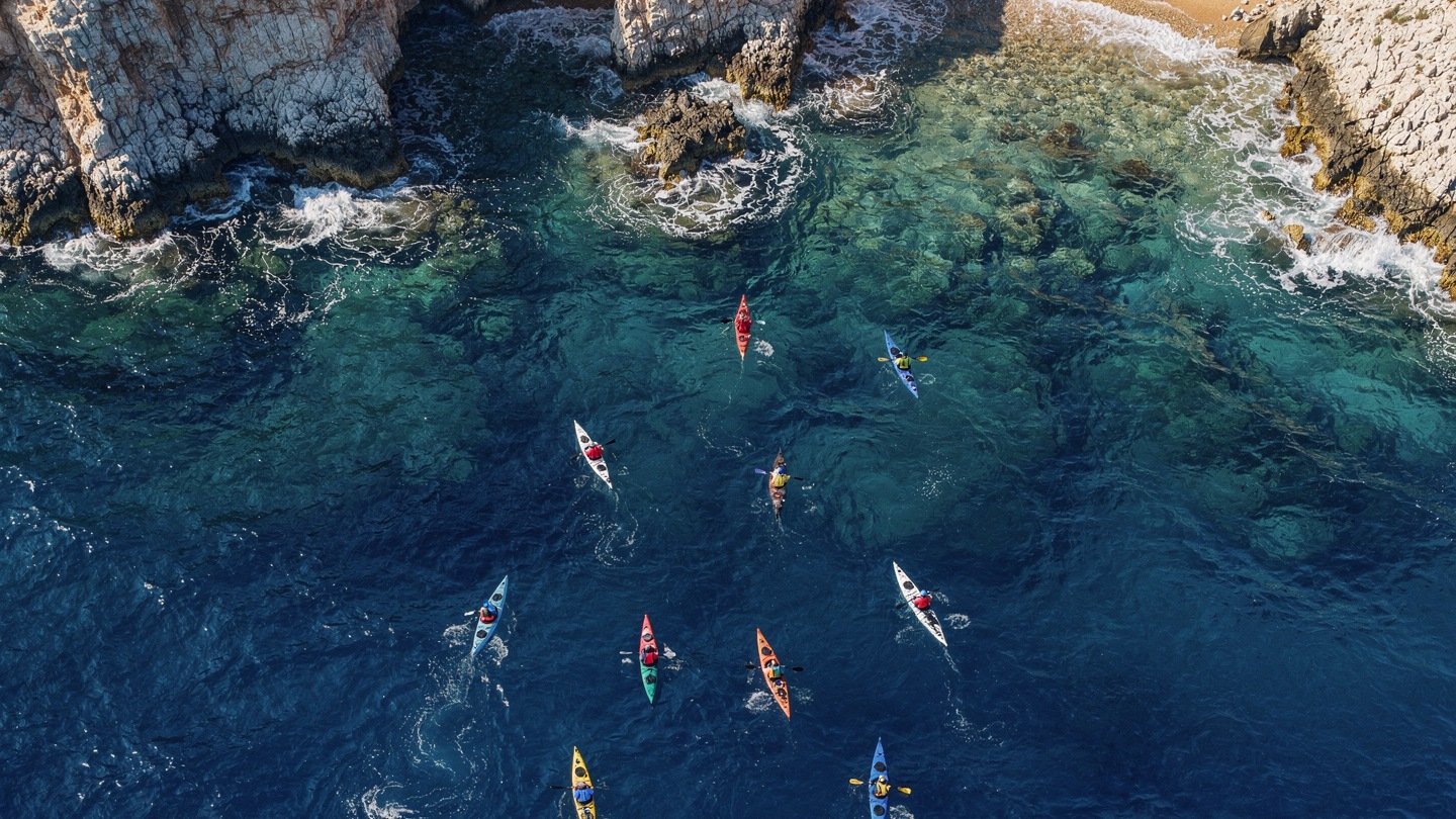 Salida en kayak desde el puerto, bordeando la costa hacia las calas protegidas