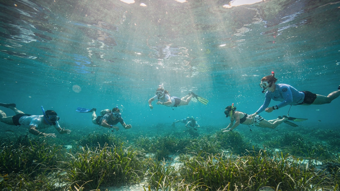Primera parada de snorkel en una cala de aguas cristalinas para observar praderas de posidonia y fauna marina