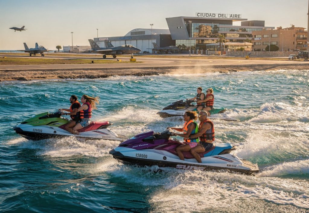Recorrido guiado de 45 minutos que incluye un briefing de seguridad de 15 minutos y 30 minutos de navegación. La ruta parte de la Playa de la Mota, costea por Lo Pagán y Santiago de la Ribera, pasa por la Ciudad del Aire y el aeropuerto militar de San Javier, incluye una parada para cambio de conductor y fotografía, cruza el ancho del Mar Menor hasta llegar al norte de La Manga, visita la zona de la encañizada y los molinos de la Calcetera y Quintín, antes de regresar al punto de partida.